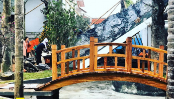 Chiếc cầu bắc qua hồ cá trước nhà dần hoàn thiện