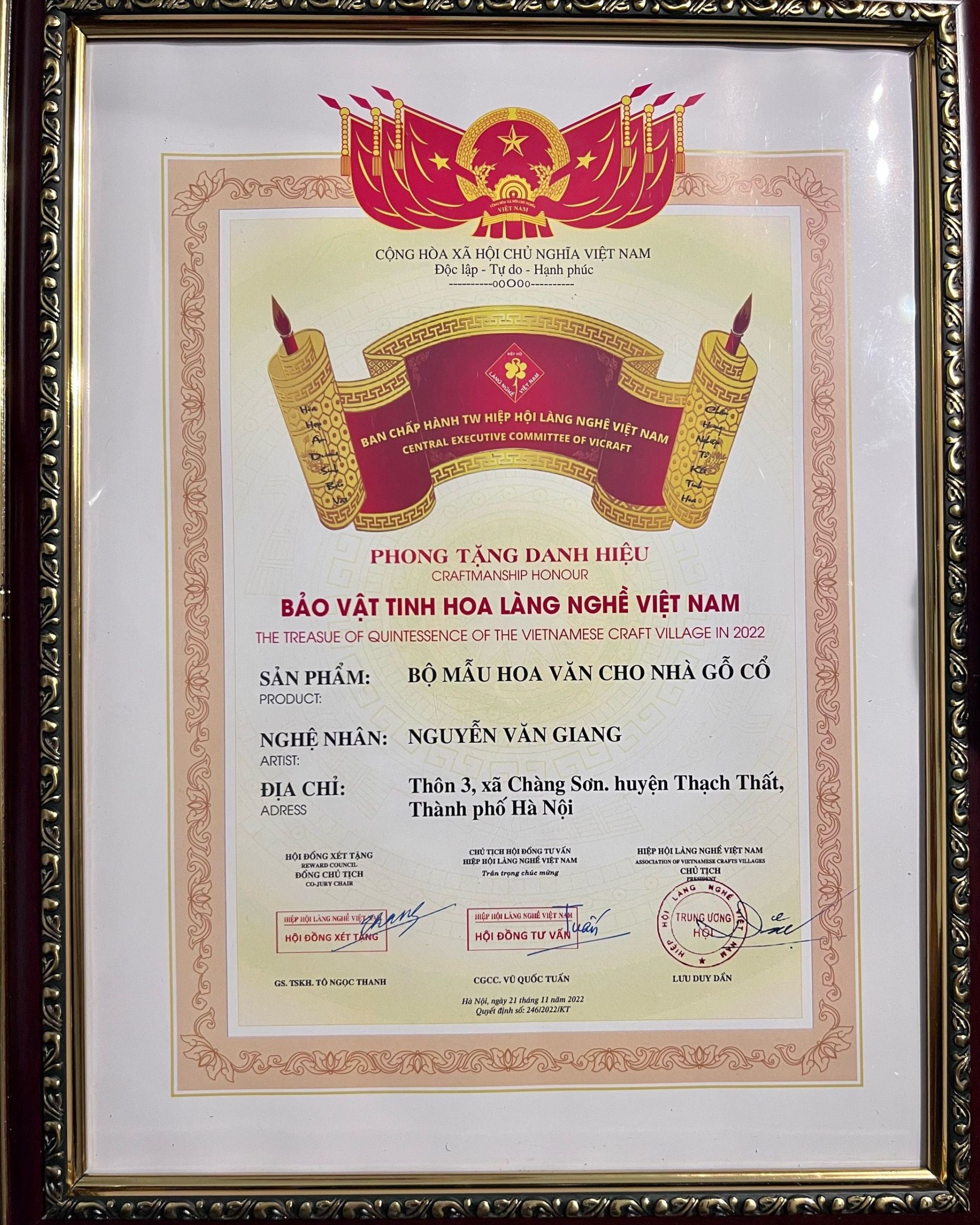 Mẫu hoa văn trên được Gỗ Giang phát triển trên nền mẫu của các cụ để lại, lấy cảm hứng từ các nét hoa văn cổ tác giả đã tạo nên mẫu riêng độc đáo này. Từ bản vẽ trên giấy, người thợ với sự tài hoa, khéo léo đã đưa tinh thần của tác giả vào từng đường đục của mình để tạo nên một tác phẩm đẹp.