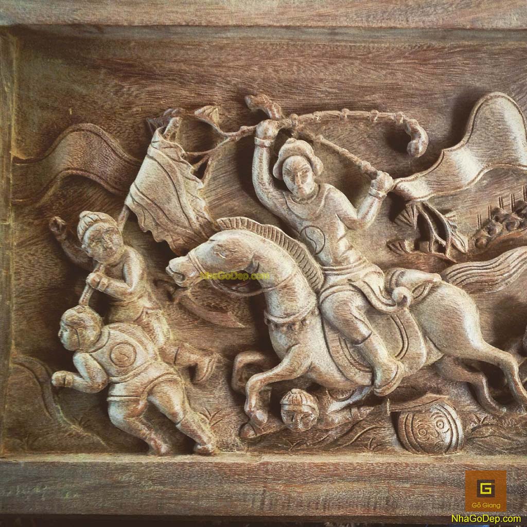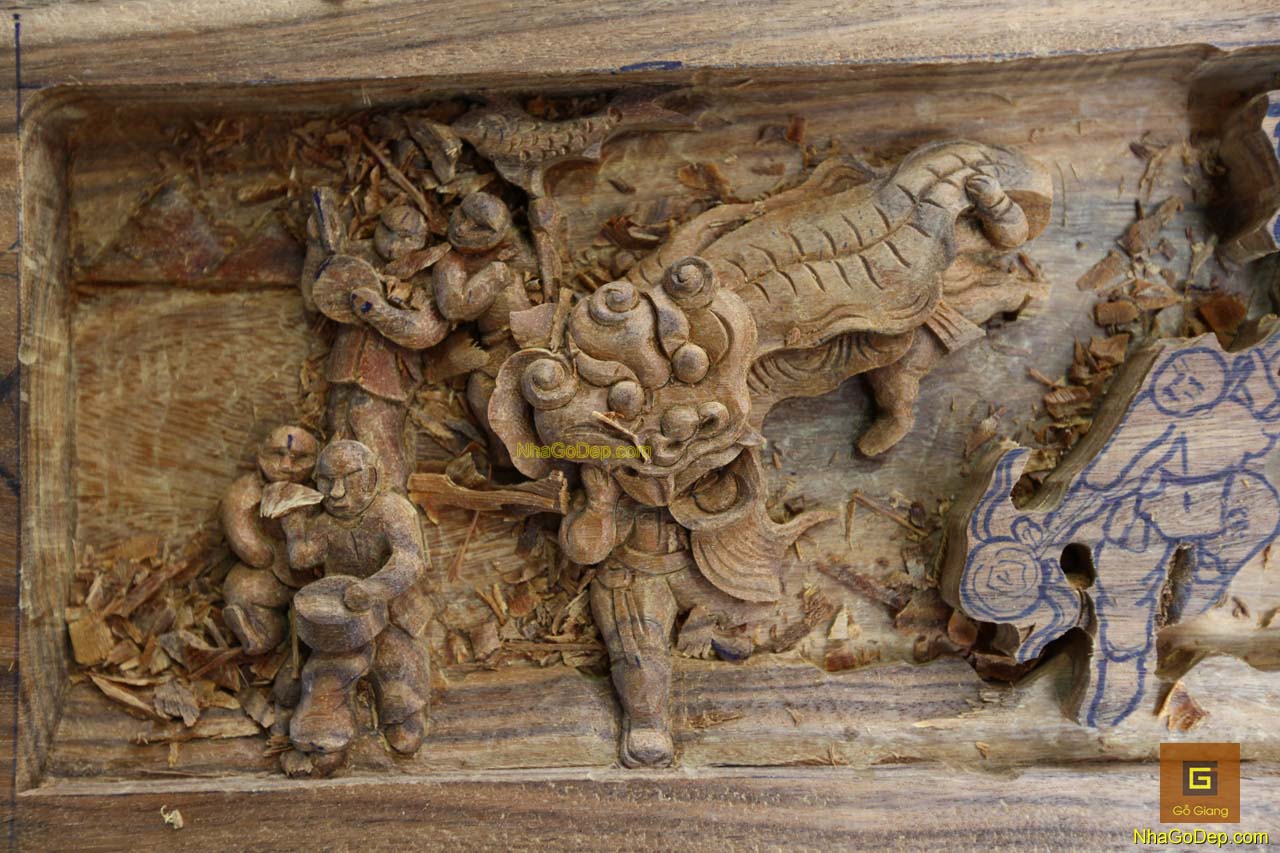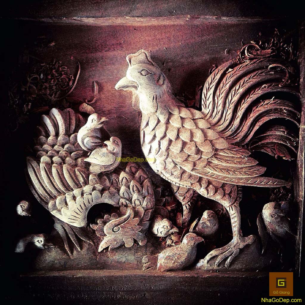 Chạm khắc của ngôi nhà gỗ độc đáo với sự đưa vào là những hình ảnh dân gian quen thuộc của Người Việt.