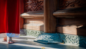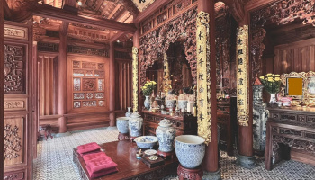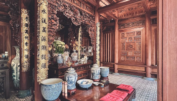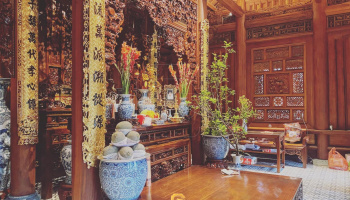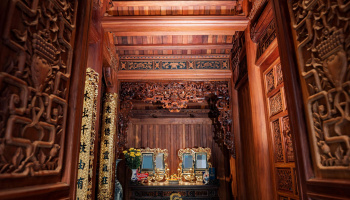 Không gian nội thất bên trong nổi bật của ngôi nhà gỗ 3 gian 2 chái truyền thống là không gian thờ cúng tổ tiên với kiến trúc thờ hai lớp. Đồ thờ được làm với chất liệu gỗ Gụ và hoàn thiện theo lối truyền thống ngâm vôi & đánh vecni bao gồm : Cửa võng, thiều châu, hoành phi, câu đối, bàn thờ, hương án, sập lễ... Điều này tạo ra không gian thờ có chiều sâu và cảm giác trang nghiêm. Do đó không gian này là nơi thể hiện lòng thành kính và tôn trọng của con cháu đối với tổ tiên, ông bà, cha mẹ.