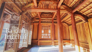 Ngôi nhà gỗ 3 gian 2 chái được thiết kế với mục đích thể hiện tinh thần hướng về cội nguồn, sự tôn trọng và thờ cúng ông bà tổ tiên.Theo ngôn ngữ truyền thống: nhà 3 gian 2 chái là kiểu nhà 3 gian 4 mái với 2 mái phụ 2 đầu hồi gọi là 2 chái nhà. Mỗi chái nhà gồm có một hàng cột quân (có thể thêm một hàng cột hiên), các hàng cột này xoay quanh vuông góc với hàng cột trong các gian chính.