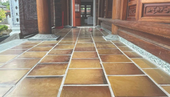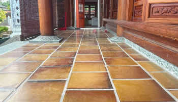 Một trong những yếu tố đặc biệt trong ngôi nhà gỗ 5 gian là sử dụng các vật liệu hoàn thiện giả cổ: gạch gốm, gạch ốp tường hồi, nề ngõa hoa văn đắp vẽ.... Một số vật liệu được sản xuất theo phương pháp hiện đại, không chỉ mang đến vẻ đẹp cổ điển cho ngôi nhà, mà còn đảm bảo tính tiện nghi và độ bền vững trong quá trình sử dụng. Màu giả cổ mang đến một vẻ đẹp hoài niệm và tinh tế, tạo ra chất cảm riêng cho ngôi nhà và đồng thời duy trì sự hài hòa với phong cách kiến trúc truyền thống.