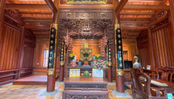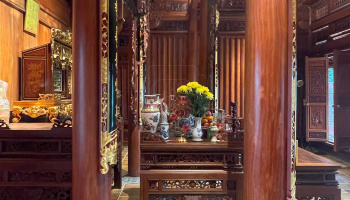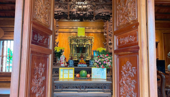 Không gian nội thất bên trong nổi bật của ngôi nhà gỗ 5 gian truyền thống là không gian thờ cúng tổ tiên với kiến trúc thờ hai lớp. Đồ thờ được làm với chất liệu gỗ Gụ và hoàn thiện theo lối truyền thống ngâm vôi & đánh vecni bao gồm : Cửa võng, thiều châu, hoành phi, câu đối, bàn thờ, hương án... Điều này tạo ra không gian thờ có chiều sâu và cảm giác trang nghiêm. Do đó không gian này là nơi thể hiện lòng thành kính và tôn trọng của con cháu đối với tổ tiên, ông bà, cha mẹ.