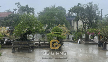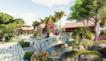 Điểm nhấn của ngôi nhà gỗ 5 gian này với không gian khuôn viên sân vườn, cảnh quan mang đậm nét đẹp làng quê, nơi gia chủ có thể thư giãn và tận hưởng không gian yên bình hòa mình cùng thiên nhiên. Sân vườn được trang trí với vườn cây, ao cá và chòi… tạo nên một không gian thư thái, dễ chịu để thưởng trà, chia sẻ những khoảnh khắc cùng người thân, gia đình.