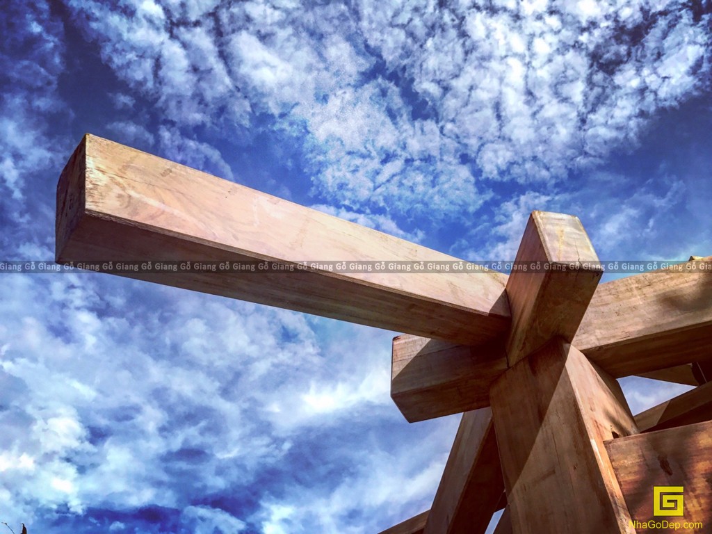 chòi gỗ tứ giác sử dụng gỗ lim Châu Phi, kích thước phủ bì khoảng 4,5m x 4,5m.