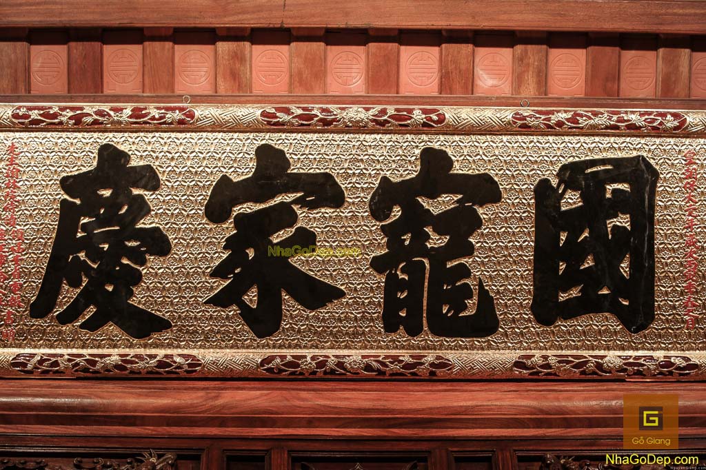 Đồ Thờ Hoành Phi, Câu Đối … rất tinh xảo và đẹp tới từng chi tiết. Những người thợ tại Gỗ Giang đã rất tâm huyết và thổi hồn cho sản phẩm. Hoành phi câu đối dát vàng, được Kts Nguyễn Giang phục chế trên nền mẫu cổ nguyên gốc có từ năm 1916 của ngôi nhà. Chất liệu là gỗ gụ và dát vàng ta với kỹ thuật cao.