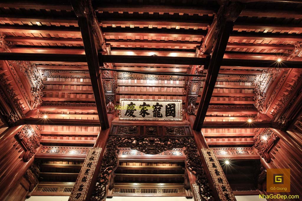 Nhà Gỗ Đẹp với tổng thể và chi tiết chạm khắc. Ngôi Nhà gỗ (nha go), được thiết kế chiếu sáng làm tôn lên vẻ đẹp của các đường nét hoa văn.