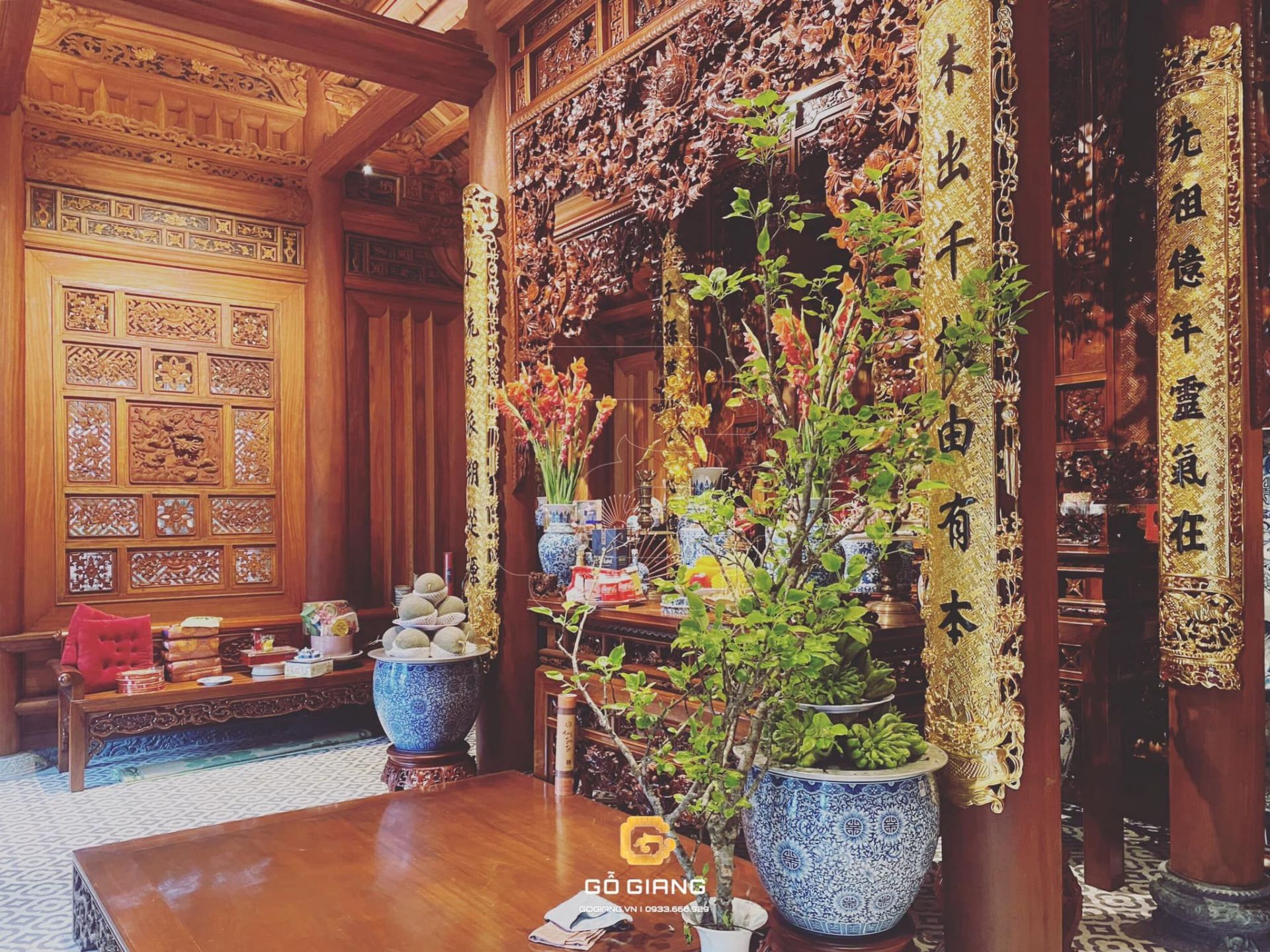 Công trình có góc đao, điểm nổi bật của công trình do Gỗ Giang hoàn thiện : chất gỗ Lim châu phi tuyển chọn, hoàn thiện dầu lau cao cấp, các hạng mục khác đồng bộ sản phẩm theo mẫu thiết kế riêng của Gỗ Giang : đồ thờ truyền thống đậm nét xứ Đoài, ngói giả cổ, đá xanh rêu, gạch mộc thu công & gốm Bát Tràng, Phụ kiện đồng…