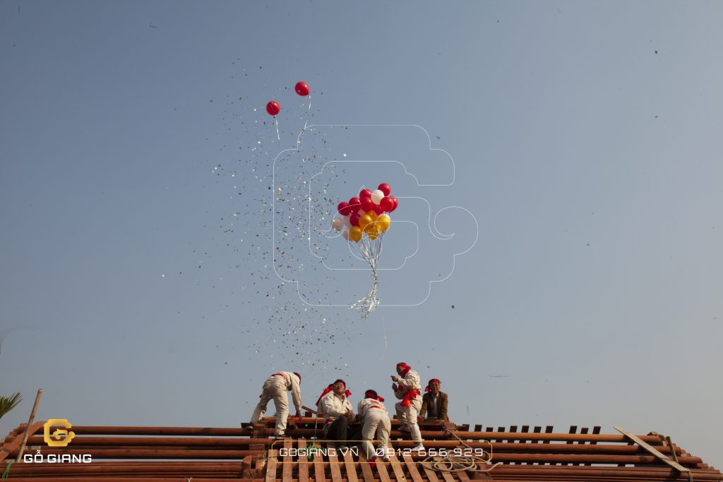 Khi lễ cúng đã xong thì cũng là lúc đồng hồ điểm 9h, thanh thượng lương được những người thợ kéo lên, gia chủ cùng những người thợ lên phần nóc và tự tay đặt thanh nóc vào đúng vị trí. Khi đã xong xuôi hết, những người thợ thả bóng bay và đốt pháo, hành động này như một lời cầu mong cho những điều mới mẻ sẽ xảy đến và xua đuổi được tà ma.