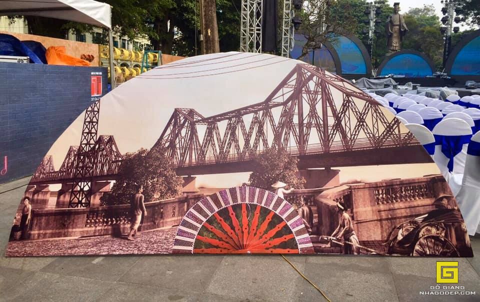 Tác phẩm quạt giấy với hoa văn cầu Long Biên đep mắt do nghệ nhân làng nghề Chàng Sơn thực hiện được trưng bày tại Lễ hội