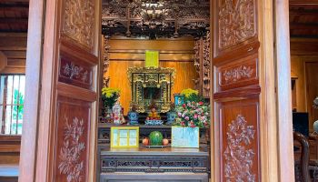 Không gian nội thất bên trong nổi bật của ngôi nhà gỗ 5 gian truyền thống là không gian thờ cúng tổ tiên với kiến trúc thờ hai lớp. Đồ thờ được làm với chất liệu gỗ Gụ và hoàn thiện theo lối truyền thống ngâm vôi & đánh vecni bao gồm : Cửa võng, thiều châu, hoành phi, câu đối, bàn thờ, hương án... Điều này tạo ra không gian thờ có chiều sâu và cảm giác trang nghiêm. Do đó không gian này là nơi thể hiện lòng thành kính và tôn trọng của con cháu đối với tổ tiên, ông bà, cha mẹ.